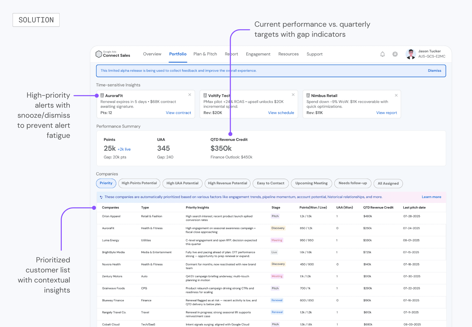 I shipped an alpha that transformed Portfolio from a static ledger into an adaptive workspace that guides sellers through their workflow, while helping them identify high-impact actions across 500+ customer accounts and capturing behavioral data to train future predictive models.