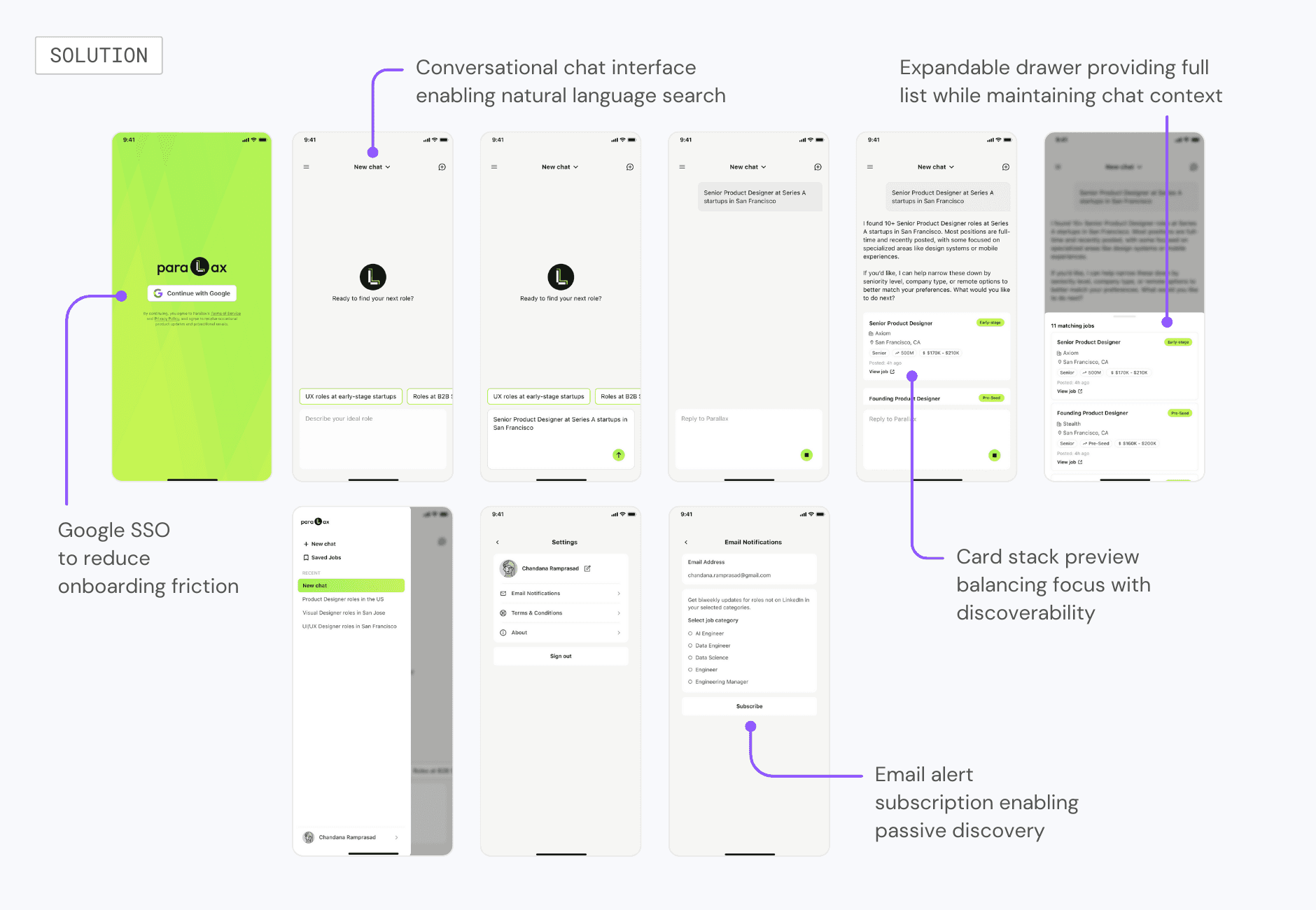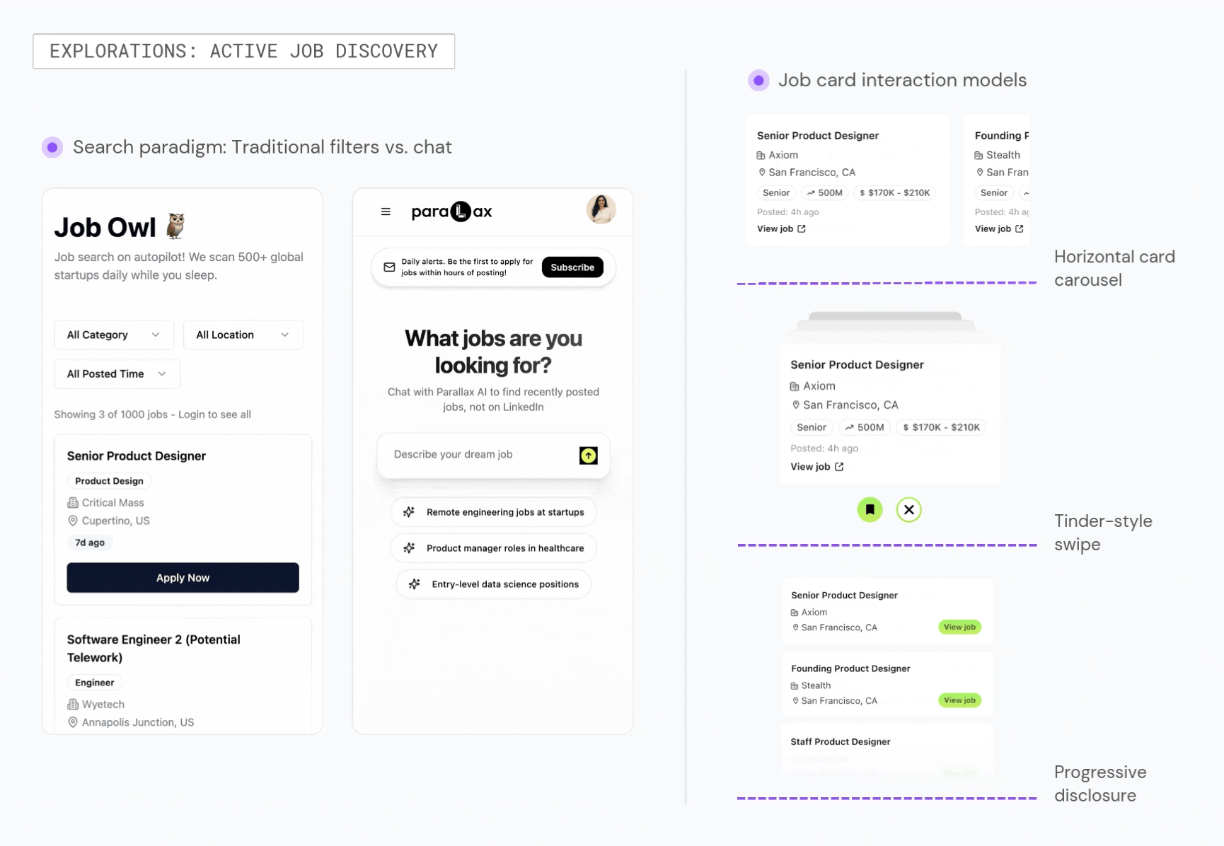 I designed and built Parallax to solve a personal pain point: the high friction, manual nature of modern job search. Parallax is an AI-first mobile web app that surfaces hidden startup opportunities in real-time through a conversational interface. By shifting the experience from manual browsing to AI-powered automation, I'm building toward a career copilot that autonomously manages the search end-to-end.